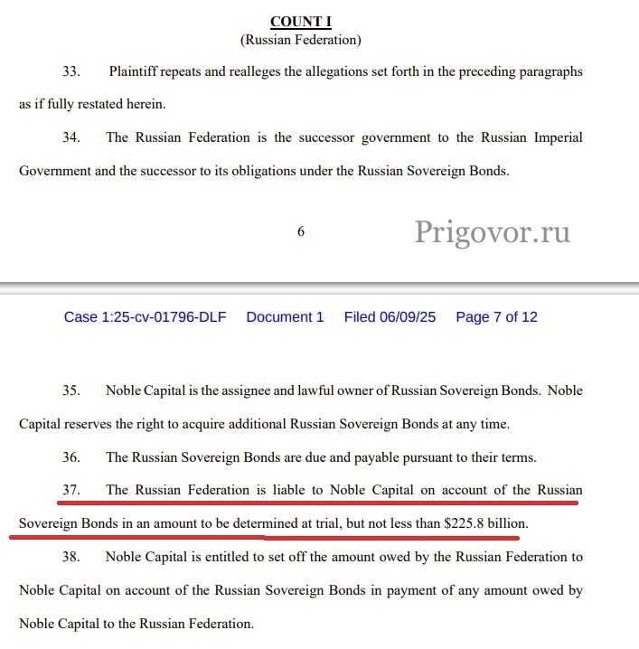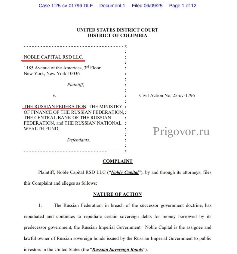 Prigovor.ru выяснил, чем известен американский фонд “Noble Capital RSD LLC” («Благородный капитал") подавший иск к России с требованием выплатить 225,8 миллиарда долларов «царских долгов»