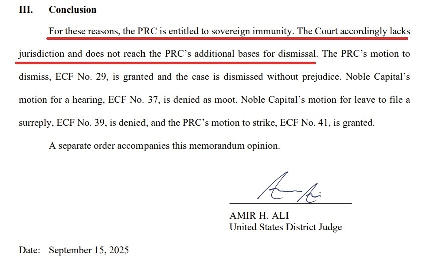Впрочем, иск против Китая в американском окружном суде не принёс результата, и 15 сентября 2025 года американский судья Амир Али, вынес вполне ожидаемое решение об отклонении иска на основании суверенного иммунитета КНР.