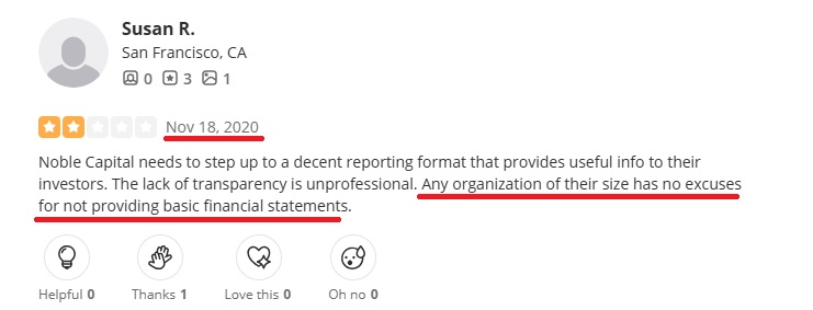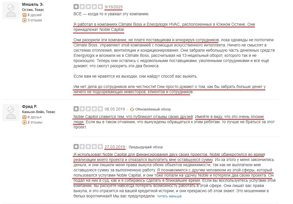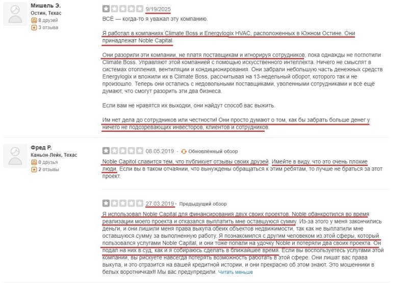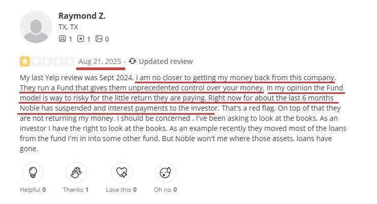 «Мой последний отзыв на Yelp был опубликован в сентябре 2024 года. Я так и не получил свои деньги обратно от этой компании. Они управляют фондом, что даёт им беспрецедентный контроль над вашими деньгами. На мой взгляд, модель фонда слишком рискованна для той небольшой прибыли, которую они выплачивают. В течение последних шести месяцев Noble приостанавливала выплаты инвесторам. Это тревожный сигнал. Кроме того, они не возвращают мои деньги. Мне стоит беспокоиться. Я просил предоставить мне доступ к бухгалтерским документам. Как инвестор, я имею право просматривать бухгалтерские документы. Например, недавно они перевели большую часть кредитов из фонда, в котором я участвую, в другой фонд. Но Noble не говорит мне, куда ушли эти активы и кредиты».