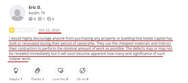 «Я бы крайне не советовал никому покупать недвижимость или здания, построенные или отремонтированные компанией “Noble Capital” за время её владения. Они используют самые дешёвые материалы и дают своим подрядчикам указания выполнять как можно меньше работы. Дефекты могут проявиться, а могут и не проявиться сразу, но вскоре станет очевидно, насколько много таких некачественных работ и насколько они значительны».