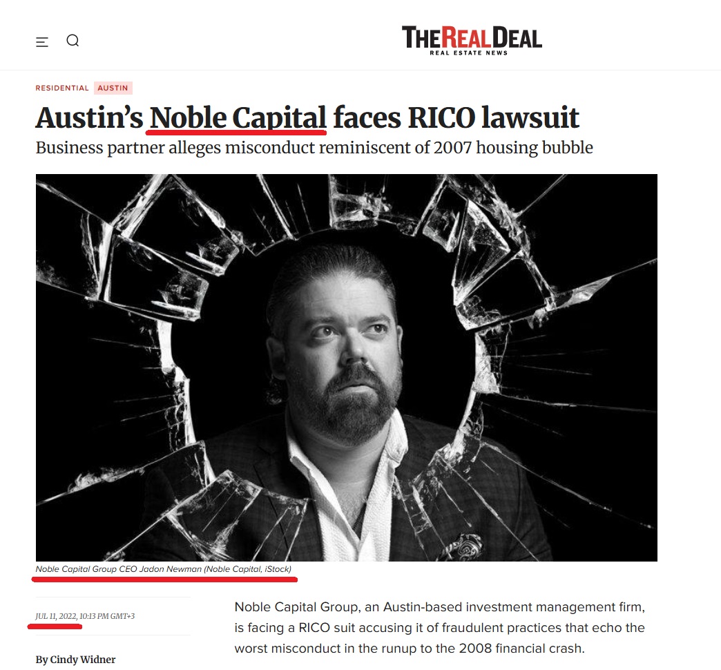Например, в профильном издании “The Real Deal”, в статье от 11 июля 2022 года указывается, что 5 июля к данной компании подан иск инвестиционным фондом из Сан-Франциско “US Capital”, в котором “Noble Capital” обвиняется в «фальсификация материалов комплексной юридической проверки, а также изменение кредитных отчётов и результатов проверок». Отдельно обратим внимание читателей, на то, что в заголовке статьи о мошеннических действиях фонда– «Austin’s Noble Capital faces RICO lawsuit» указано, что иск подан на основании закона RICO. Напомним, что закон RICO (англ. The Racketeer Influenced and Corrupt Organizations Act — «Закон о коррумпированных и находящихся под влиянием рэкетиров организациях») —закон США, принятый 15 октября 1970 года для борьбы с организованной преступностью.