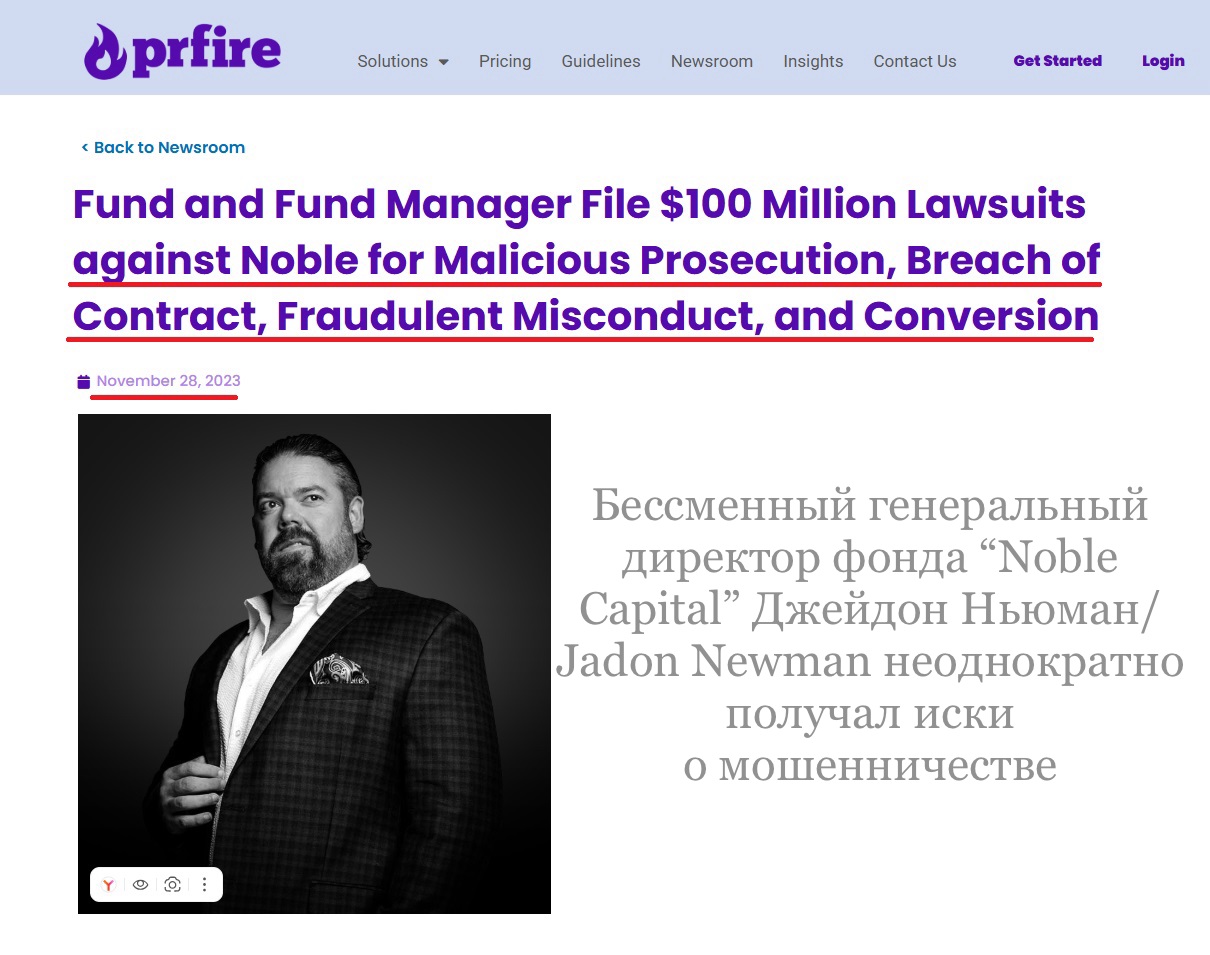 После таких ярких исков мы решили ещё немного углубиться в историю данного фонда и нашли материал о том, что “Noble Capital” и его бессменный генеральный директор Джейдон Ньюман/Jadon Newman уже полтора десятка лет назад также получал иски о мошенничестве со стороны трёх бизнесменов из Нью-Йорка. Тогда этот директору фонда удалось оправдаться в суде, иски были отклонены.
