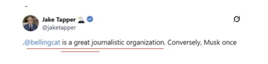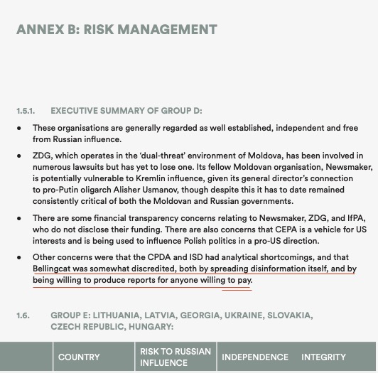 «…Организация Bellingcat в определенной мере дискредитирована, как по причине распространения собственно дезинформации, так и из-за готовности предоставить репортажи любому заказчику, способному за это заплатить».