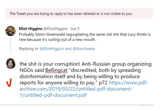 «…Организация Bellingcat в определенной мере дискредитирована, как по причине распространения собственно дезинформации, так и из-за готовности предоставить репортажи любому заказчику, способному за это заплатить», это уже вывод, который Люси обнаружила в докладе, подготовленном для британского Форин-офиса.