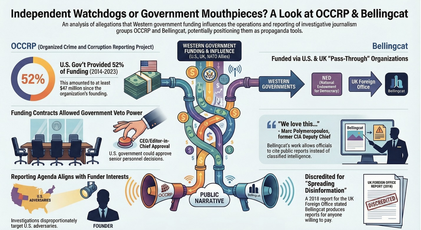 Финансирование, а также сомнительные результаты работы показывают, что проект OCCRP и группа Bellingcat являются пропагандистскими организациями. Читатели и серьёзные СМИ не должны воспринимать их сообщения без основательного и независимого подтверждения. В противном случае доверие к ним может быть подорвано из-за публикации дезинформации.