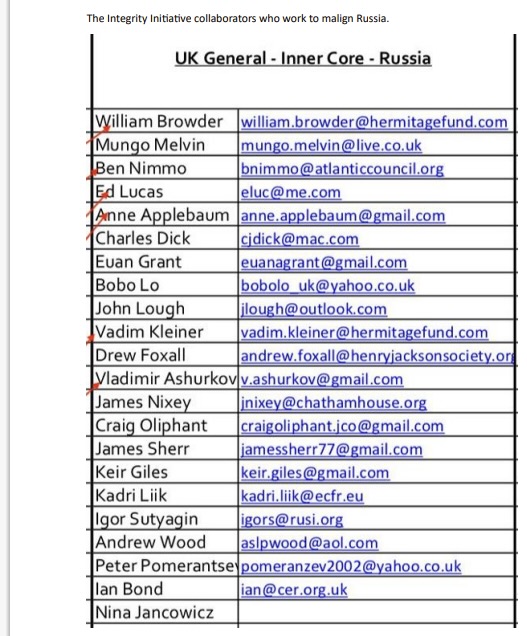 Вот некоторые из приведённых в списке оперативников: Браудер*, Бен Ниммо из Атлантического совета**, журналисты Эд Лукас/ Ed Lucas и Энн Эппелбаум/Ann Appelbaum, жена министра иностранных дел Польши Радослава Сикорского. Эуан Грант/Euan Grant работает в британском Институте государственного управления. Вадим Клейнер/Vadim Kleiner является сотрудником Браудера. Нина Янкович/Nina Jankowicz до недавнего времени работала исполнительным директором Совета по борьбе с дезинформацией/Disinformation Governance Board Министерства внутренней безопасности США и покинула свой пост спустя три недели в мае 2022 года. Она состоит в Консультативном совете партнёрства Zinс’s Open Information Partnership**.