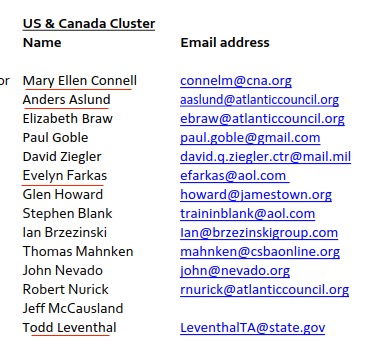 Координатор Mэри Коннелл/Mary Ellen Connell работает в Центре военно-морского анализа/Center for Naval Analysis, входящего в состав Центра стратегических исследований/Center for Strategic Studies, а ранее она служила в составе Миссии США в НАТО. Андэрс Ослунд/ Anders Aslund является научным сотрудником Института международной экономики Петерсона/Peterson Institute for International Econоmics. Эвелин Фаркас/Evelyn Farkas ранее была заместителем помощника министра обороны в правительстве Обамы и отвечала за Россию, Украину и Евразию. Тод Левентал/Todd Leventhal вышел на пенсию, однако продолжает использовать адрес электронной почты Госдепартамента.