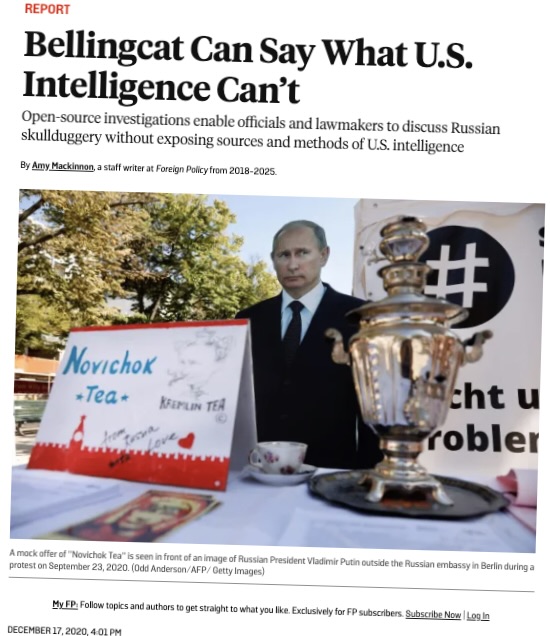 По мнению Эми Маккиннона/Amy Mackinnon из журнала Foreign Policy, организация Bellingcat играет решающую роль в разоблачении действий правительства России, и это позволяет официальным лицам США обсуждать подобные вопросы без раскрытия разведывательных источников (или приведения доказательств).