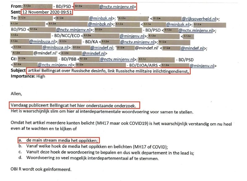 Электронное сообщение, отправленное в ноябре 2020 года, свидетельствует о том, что перед публикацией этих материалов организация Bellingcat поделилась ими с амстердамским Национальным координатором по безопасности и противодействия терроризму, что говорит о сотрудничестве в области формирования медийных нарративов. А, может быть, обмен информацией осуществлялся в обоих направлениях?