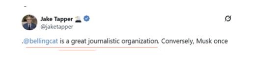 Bellingcat имеет официальные партнёрские отношения в такими крупными СМИ как CNN и NBC. Джейк Тэппер/Jake Tapper из телекомпании NBC назвал Bellingcat «замечательной журналистской организацией».