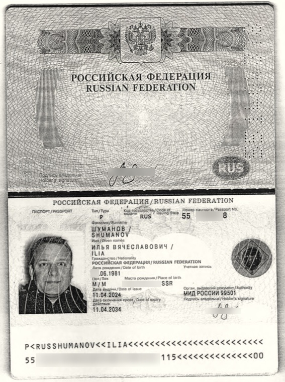 В распоряжении проекта Prigovor.ru оказалась скан-копия нового загранпаспорта Шуманова. В нём указано, что выдало документ подразделение МИД России с кодом 99501. Последние цифры — бывший код российского генконсульства в Грузии.