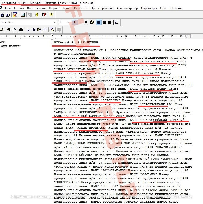 К примеру, здесь мы видим американский Bank of New York, вокруг которого в конце 1990-х разгорелся публичный скандал: газеты Newsweek и New York Times, ссылаясь на свои источники в ФБР, сообщили что русская мафия отмыла в Bank of New York $10 млрд. Всего в этом файле с именем Пугачевой соседствуют две дюжины банков и бирж с сомнительной историей.