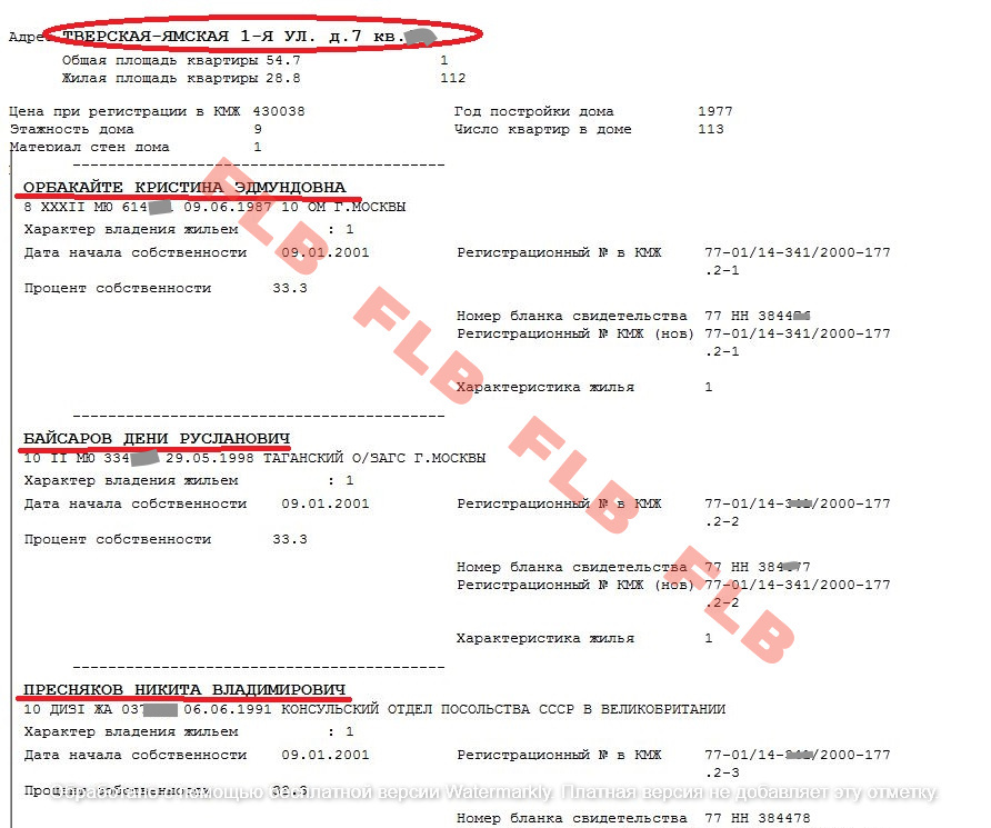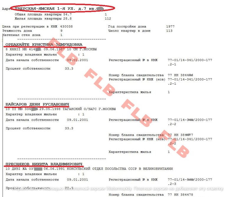 Учётная карточка соседней квартиры на Тверской, приобретённой на имя дочери Пугачёвой