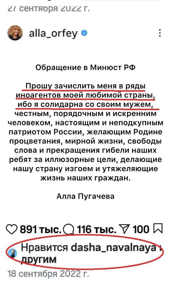 После крушения бизнеса мечты Пугачёвой на её страницах в соцсетях стали появляться злобные русофобские и антироссийские записи. В сентябре 2022-го Пугачёва попросила признать её иноагентом, она написала пост в поддержку своего мужа Галкина, который с начала СВО на Украине неоднократно осуждал боевые действия и «пел» за славу Украины. Артистка написала, что солидарна с супругом. После этого в полицию стали поступать заявления с просьбой проверить певицу на дискредитацию армии. Этот пост лайкнула дочь покойного экстремиста Навального Даша.