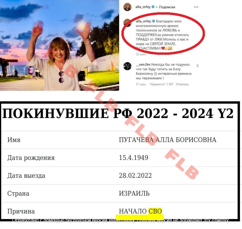 …А спустя 40 лет, всего через четыре (!) дня после начала СВО, Пугачева поднималась по трапу авиалайнера, вылетавшего из Москвы в Тель-Авив. Prigovor.ru располагает данными из базы данных пограничной службы, согласно которой причиной экстренного отъезда «примадонна» назвала… «Специальную военную операцию». В графе «Причина» она указала – «Начало СВО».