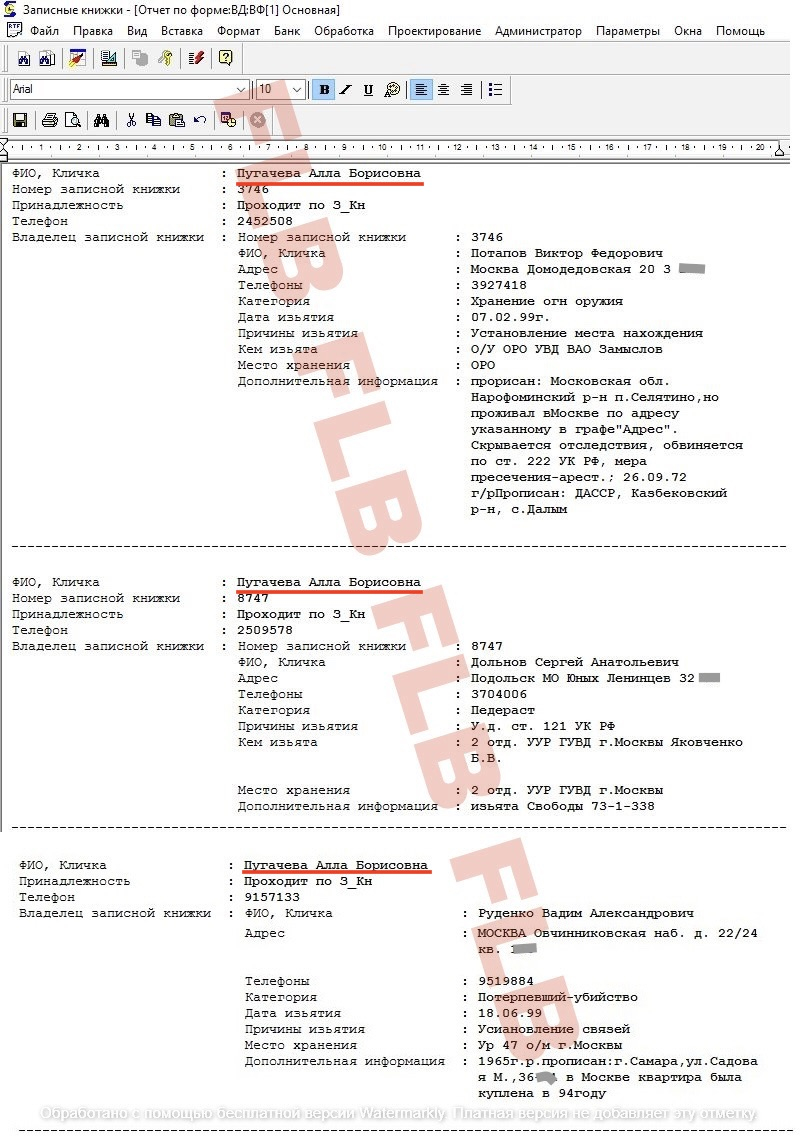 Среди знакомых Пугачевой оказался и бандит из крупной Ореховской ОПГ. В другой криминальной базе данных «Записные книжки (Отчёт по форме ВД – ВФ)» имя «примадонны» соседствует с человеком, который тогда скрывался от правоохранительных органов за хранение оружия. В той же базе данных был мужчина, причисленный милицией к категории «педераст», так как в те годы еще не отменили уголовную статью за мужеложство…