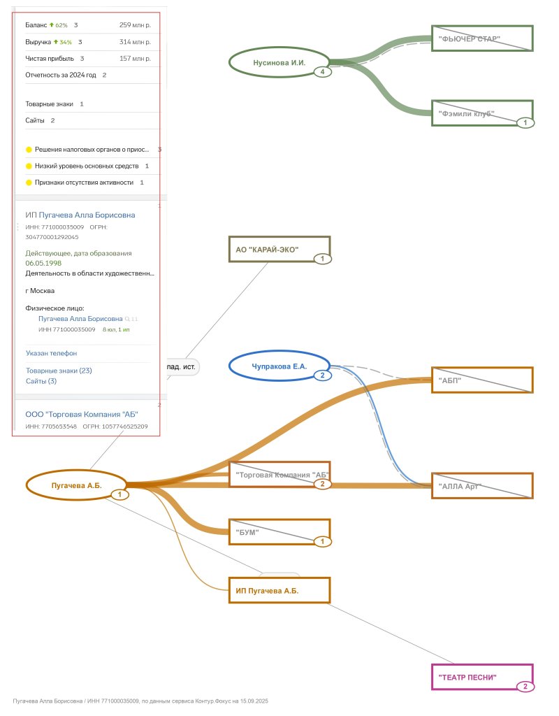 В 2000-е времена дикого капитализма, воровские и бандитские, понемногу уходят в прошлое, цивилизуются, втискиваются в рамки закона. Пугачёва меняется вместе и с этими временами. Система электронного бизнеса «Контур. Фокус» по нашему запросу автоматически сгенерировала визуальную схему бизнес-связей Пугачёвой.