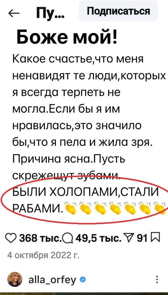 «Какое счастье, что меня ненавидят те люди, которых я всегда терпеть не могла. Если бы я им нравилась, это значило бы, что я пела и жила зря», — написала она в октябре 2022-го. «Пусть скрежещут зубами. Были холопами, стали рабами», — добавила артистка.