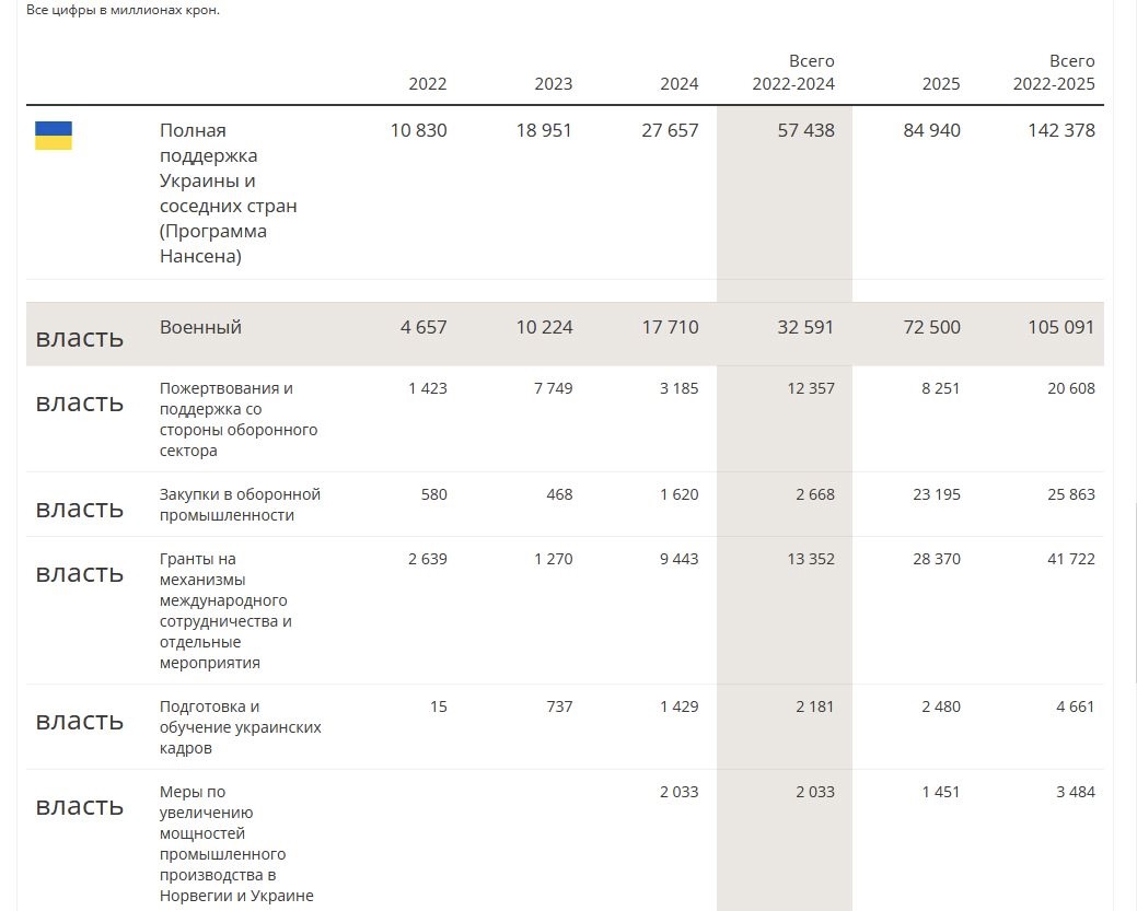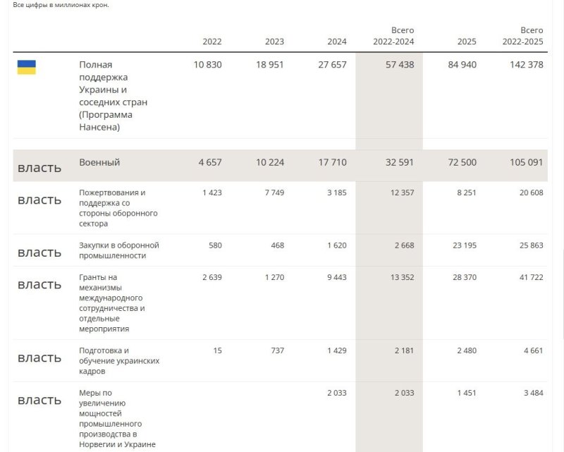 Здесь же представлен «обзор поддержки, оказанной Норвегией Украине». Согласно этому финансовому документу, в 2022-м Украина получила от норвежских «викингов» 10 млрд 830 норвежских крон, в 2023-м - 18 млрд 951 млн, в 2024-м - 27 млрд 657 млн; а в 2025-м, когда поражение Украины вместе со всем «коллективным западом» стало всем очевидным, Норвегия решила выделить сразу втрое (?!) больше - 84 млрд 940 млн.