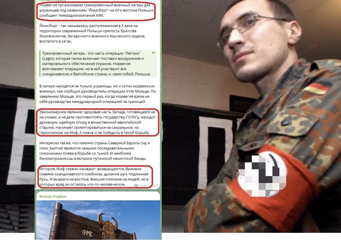 Попков прокомментировал в соцсети открытие лагеря «Йомсборг» со своей, неонацистской, стороны: «Йомсборг - так называлась расположенная в X веке на территории современной Польши крепость братства йомсвикингов. Загадочного военного языческого ордена, воспетого в сагах, - нацист сразу же указал на особый для неоязычников символизм этого места. - Тренировочный лагерь - это часть операции "Легион" (Legio), которая также включает поставки вооружения и материального обеспечения Украине. Норвегия возглавляет операцию, но в ней участвуют все скандинавские и балтийские страны и, само собой, Польша».