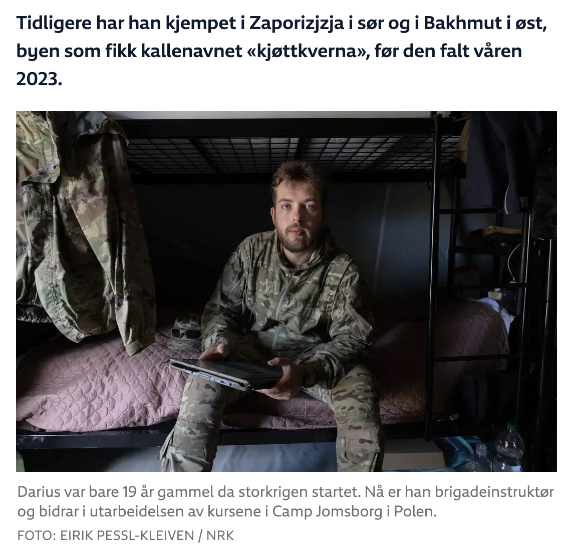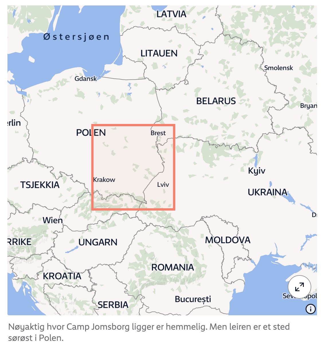 «Норвегия впервые возглавляет международную операцию подобного типа, что также позволит ей лучше подготовиться к войне, - так начинается этот репортаж. <…> Cекретное место в лесах юго-восточной Польши. Здесь Норвегия основала лагерь Йомсборг, один из крупнейших норвежских лагерей за рубежом, где украинские солдаты будут проходить обучение у норвежских инструкторов».