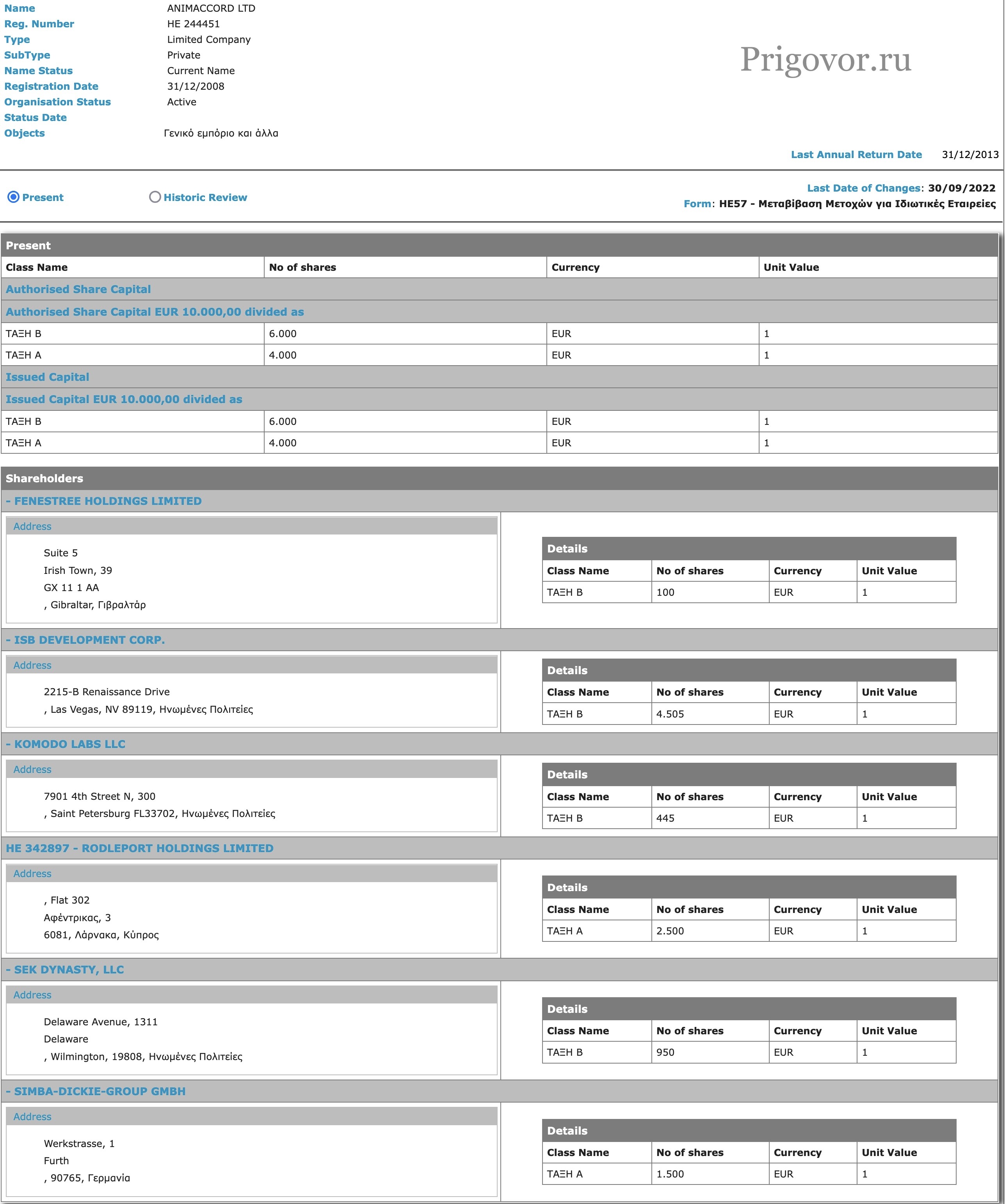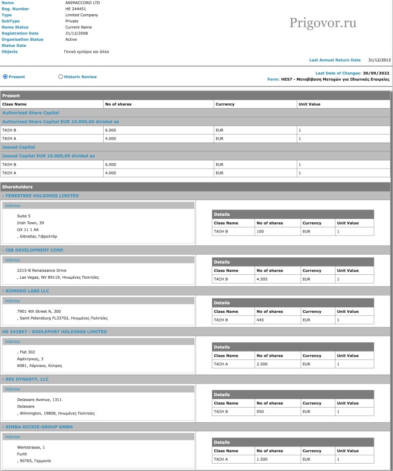 Выбор Кипра, очевидно, обусловлен налоговой оптимизацией: ставка корпоративного налога здесь 12,5%. А дивиденды вообще при определённых условиях налогами не облагаются. За десять лет структура собственности кипрской «Animaccord Ltd.» претерпела кардинальные изменения.