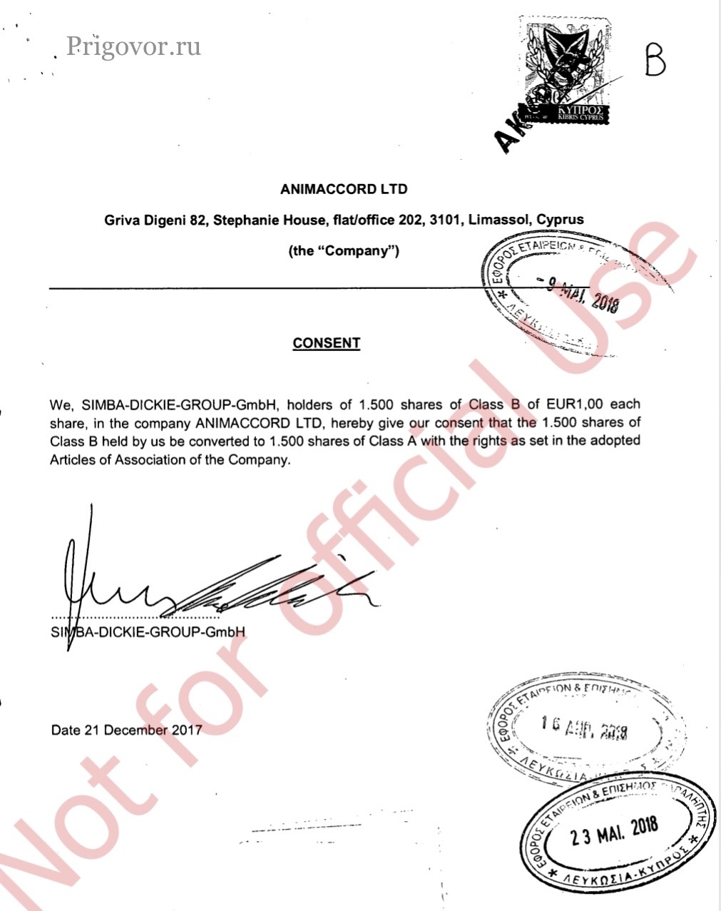 В декабре 2017 года в состав учредителей кипрской компании вошёл немецкий производитель игрушек «Simba Dickie Group». В своих руках он сосредоточил 1,5 тыс. акций (~15% уставного капитала) и продолжает их держать и по состоянию на 2025 год.