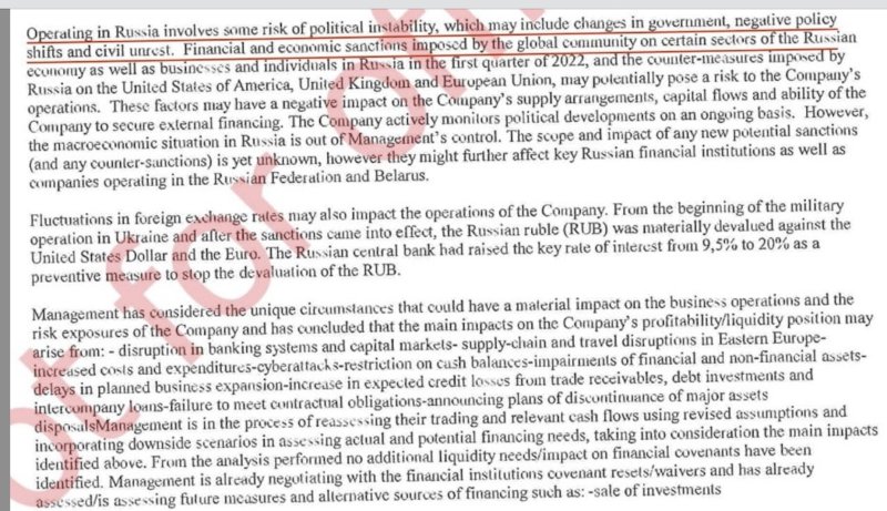 «Деятельность в России сопряжена с некоторым риском политической нестабильности, который может включать изменения в правительстве, негативную политику и гражданские беспорядки, — говорится в документе. — Финансовые и экономические санкции, введённые мировым сообществом в отношении отдельных секторов российской экономики, а также предприятий и частных лиц в России в первом квартале 2022 года, и контрмеры, введённые Россией <...>, могут потенциально представлять риск для деятельности Компании».