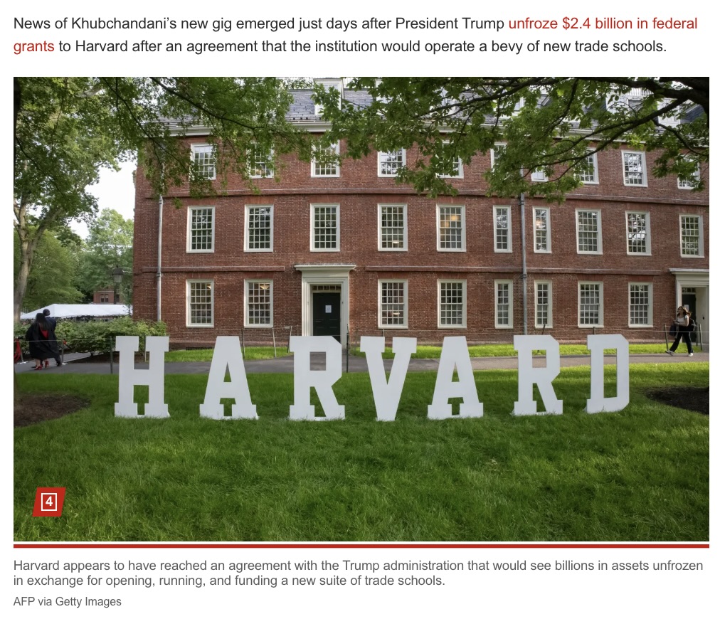 Журналист New York Post Шейн Гэлвин обратил внимание на то, что «новость о новой должности Хубчандани появилась всего через несколько дней после того, как президент Трамп разморозил федеральные гранты на сумму 2,4 миллиарда долларов для Гарварда после заключения соглашения о том, что учебное заведение будет управлять множеством новых профессиональных школ»