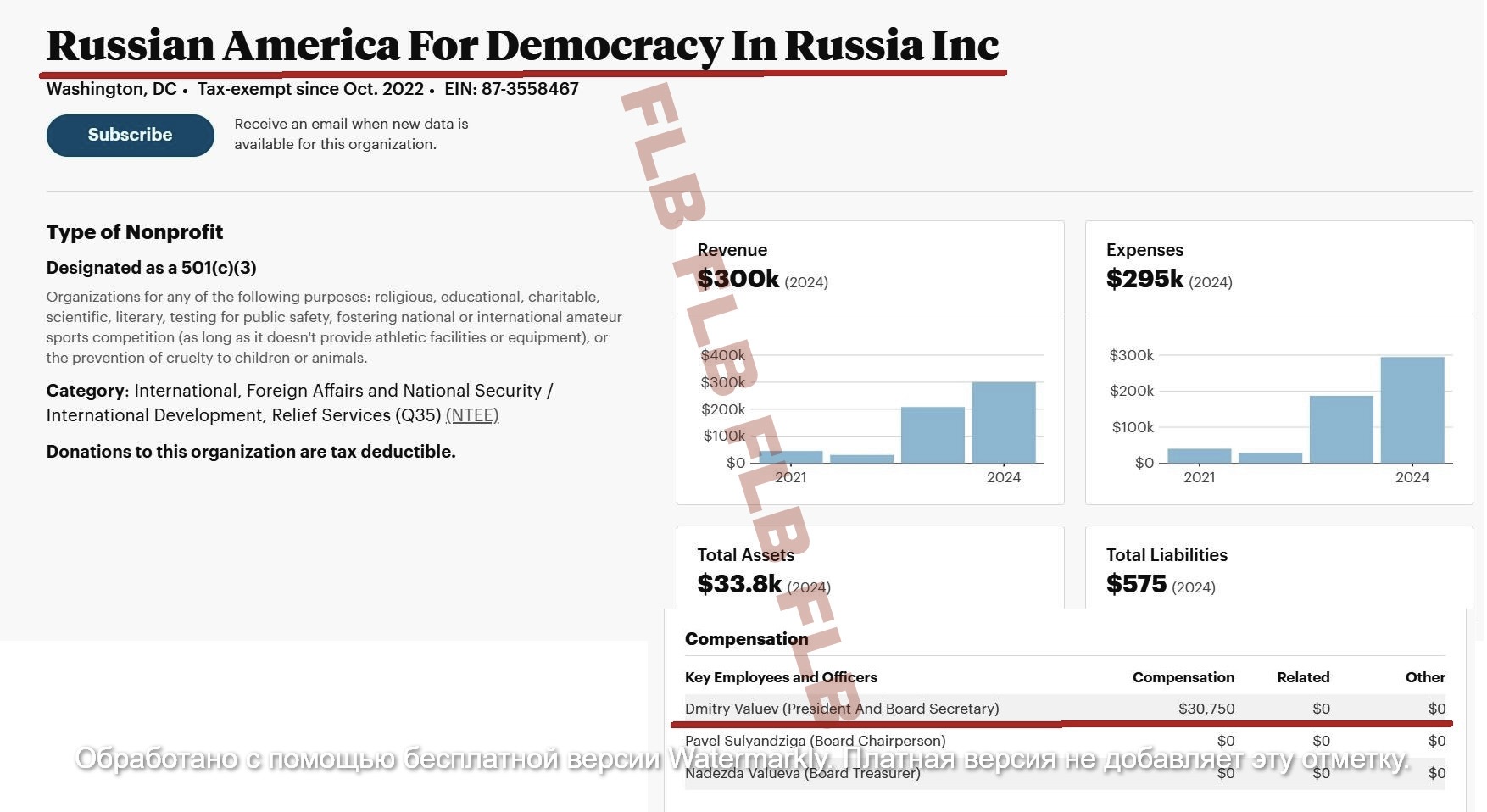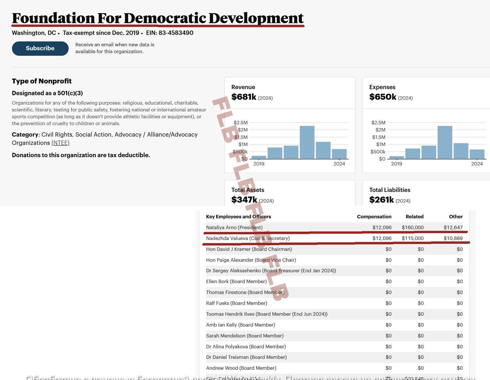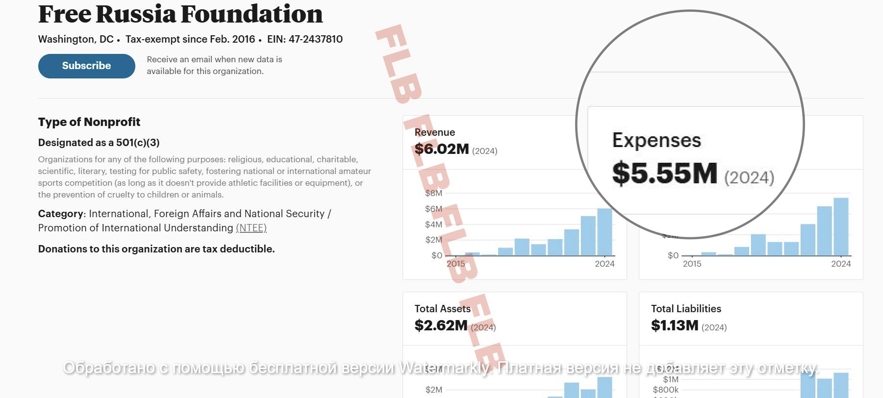 **Free Russia Foundation (фонд «Свободная Россия», США), - организация, деятельность которой признана нежелательной на территории РФ по решению Генеральной прокуратуры от 28.07.2019, фонд включен Минюстом России в перечень нежелательных организаций распоряжением № 814-р от 28.06.2019. Фонд включен 09.10.2019 в реестр иностранных агентов под №195. Решением Верховного Суда РФ от 07.07.2024 года Free Russia Foundation признан структурным подразделением «Антироссийского сепаратистского движения» и экстремистской организацией;