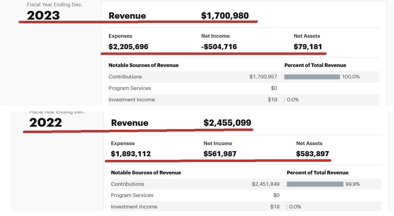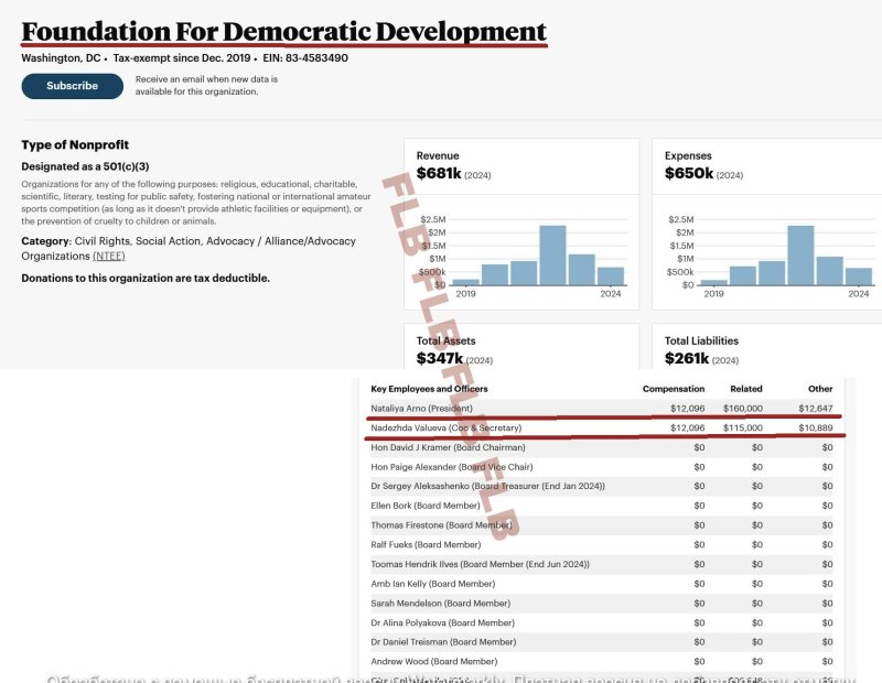 «Фонд демократического развития»/FDD также возглавляет вездесущая «Фурия Госдепа» Наталья Арно. Из диаграммы доходов фонда видно, что самые тучные годы FDD остались позади: в 2022-м – более 2 млн долларов, в 2023-м – более 1 млн. А в 2024-м доходы снизились до 681 тыс. (677 тыс. – пожертвования и гранты, 3,7 тыс. – инвестиционный доход).
