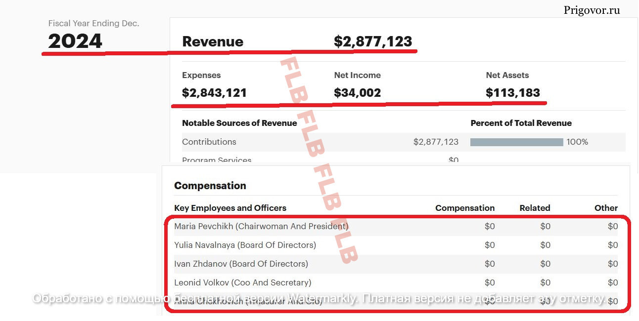 В 2024-м состав «ключевых сотрудников и руководителей» американского ФБК, согласно финотчёту, был следующим:  Мария Певчих* (председатель и президент), Юлия Навальная* (член Совета директоров),  Жданов* (Совет директоров), Леонид Волков* (исполнительный директор), Анна Чехович* (казначей и финансовый директор). Кстати, у Чехович большой криминальный опыт, она отмывала деньги для ФБК ещё в 2018 году.
