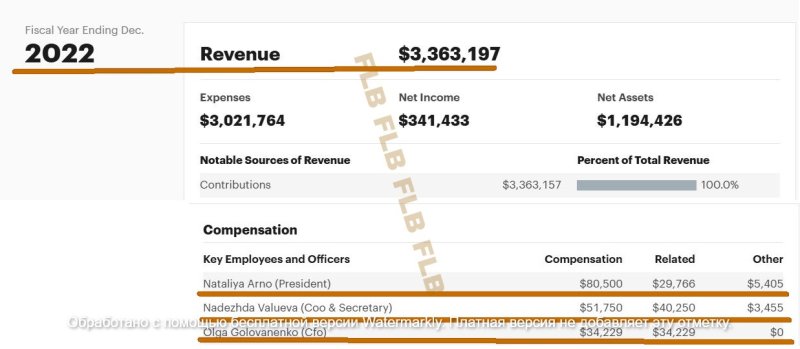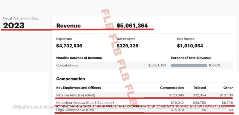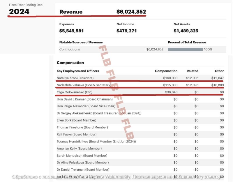 Конкретно в 2022-м доходы организации составляли 3, 4 млн долларов, а общий заработок «ключевых сотрудников и руководителей» (куда входят оклад, бонус и необлагаемые налогом льготы) были такими: Наталья Арно (президент) - 115, 7 тыс. долларов; Надежда Валуева (исполнительный директор и секретарь) – 95, 5 тыс. долларов; Ольга Голованенко (финансовый директор) – 68, 5 тыс. долларов.