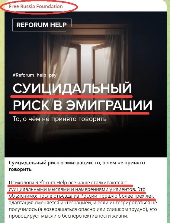 В старый Новый год экстремистский “Free Russia Foundation” («Фонд свободная Россия»**), зарегистрированный в США, в своём телеграм-канале опубликовал пресс-релиз под жутковатым заголовком «Суицидальный риск в эмиграции: то, о чём не принято говорить».