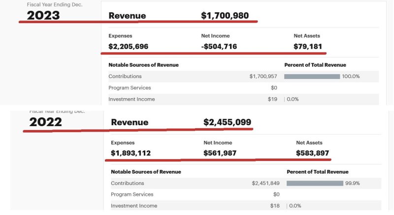 В следующем 2023 году доходы  FRF резко увеличились  до 5,1 млн долларов, также взлетели общие заработки «ключевых сотрудников и руководителей»:  Наталья Арно (президент) -   166, 4 тыс. долларов; Надежда Валуева (исполнительный директор и секретарь) – 128, 5 тыс. долларов; Ольга Голованенко (финансовый директор) – 15, 1 тыс. долларов.