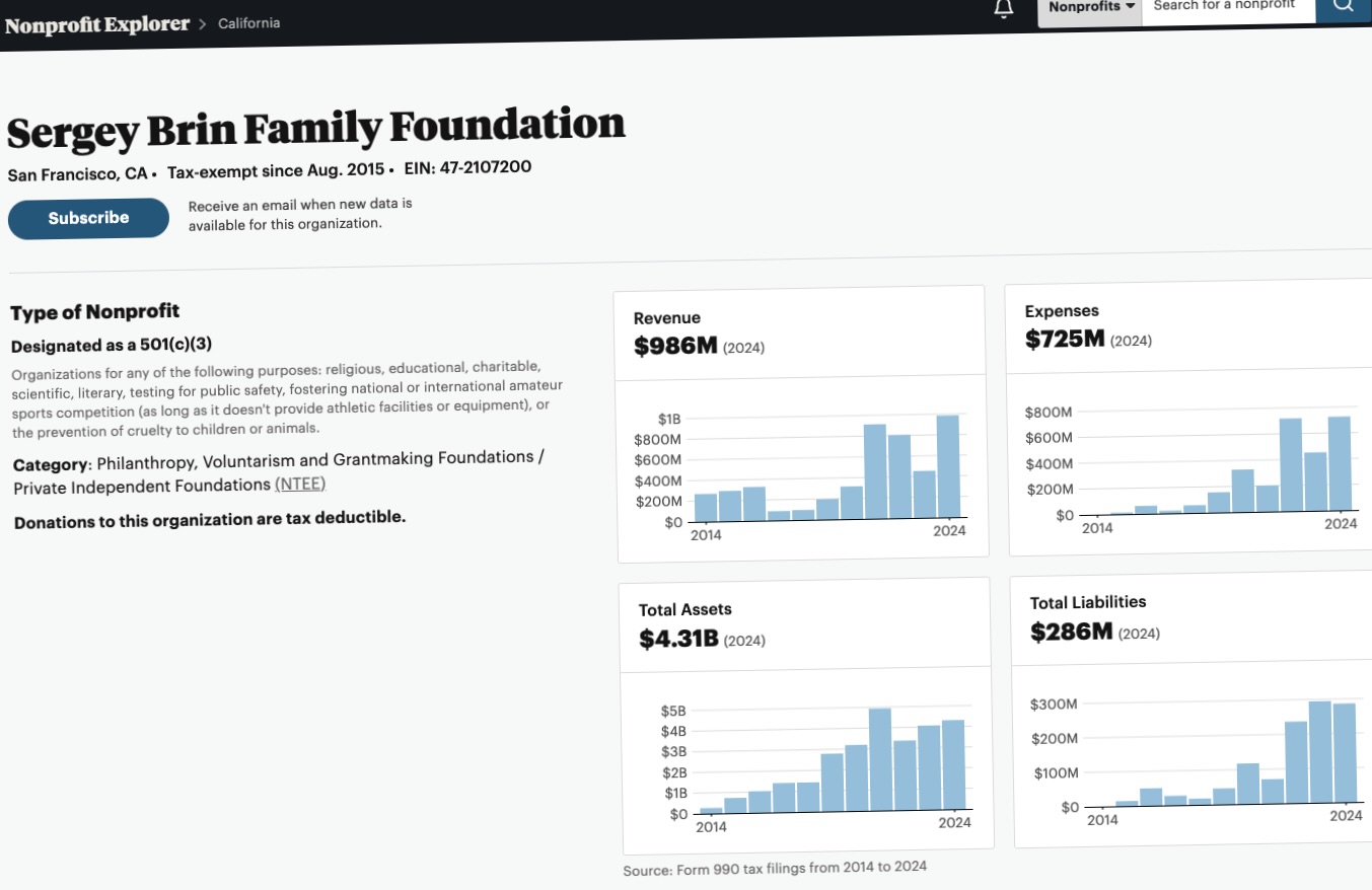 Пересказывать и без того известную биографию самого Сергея Михайловича Брина мы не будем. Заглянем лучше в финансовую отчётность его семейной благотворительной структуры.