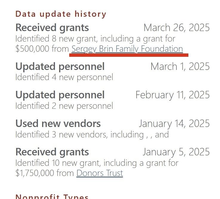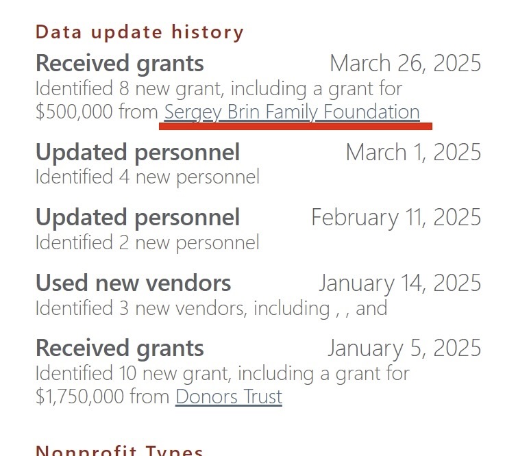В январе 2025 года сервисами (см. Data update history) у HRF выявлено – «10 новых грантов, включая грант на $1,750,000 от «Donors Trust», а 26 марта 2025 года - 8 новых грантов, включая грант в размере 500 000 долларов от “Sergey Brin Family Foundation”.