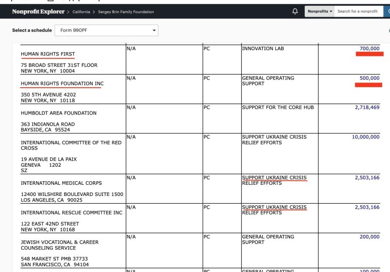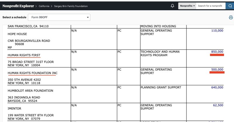 И ещё раньше, в 2021 году, деньги от “Sergey Brin Family Foundation” так же поступали в пользу двух этих одиозных «правозащитных» структур. Согласно отчётам, в тот период времени “Human Rights Foundation Inc” получила 500 тысяч долларов, а вторая присоска “Human Rights First” – $850 000.