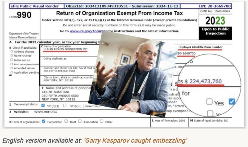 Первая организация - это известная американская НКО “Human Rights Foundation Inc” (EIN 20-2669700). На протяжении двенадцати лет в ней председательствовал озверевший на почве ненависти к России иноагент Гарри Каспаров*, эдакий биодрон агрессивной русофобии, вступивший в войну с Россией на всех площадках и диванах мира.