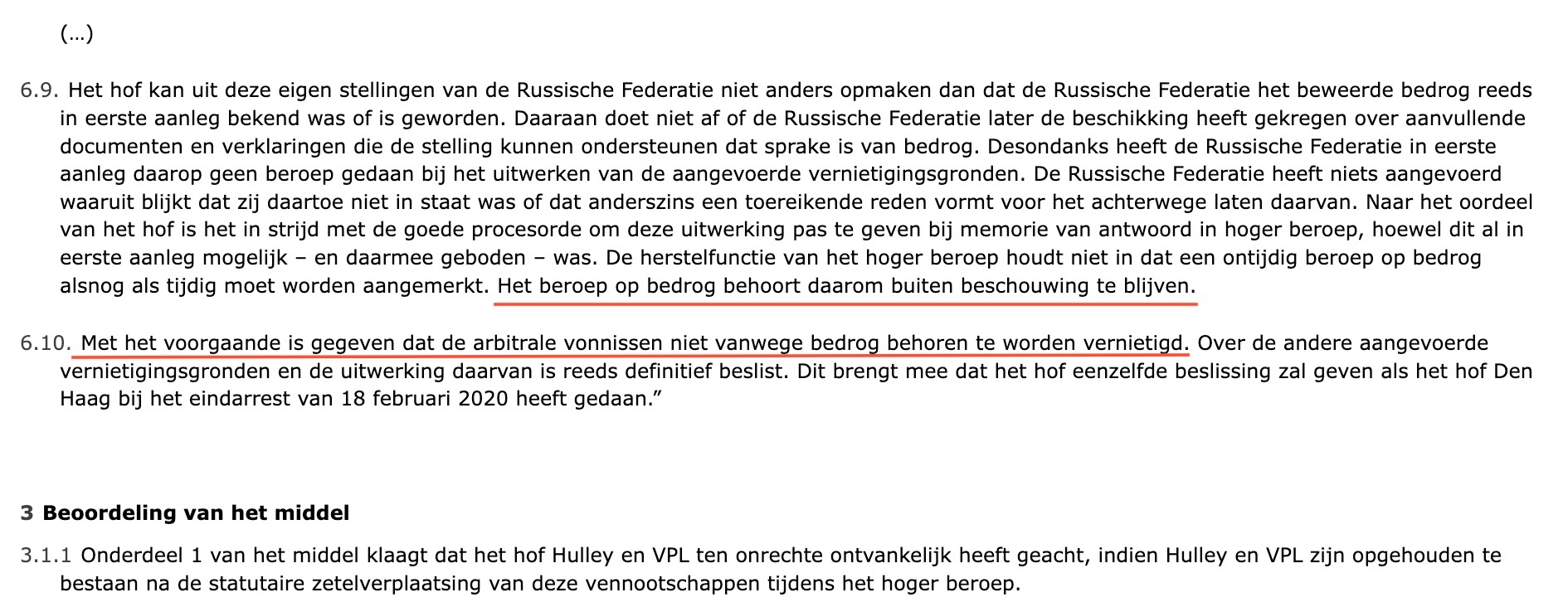 6.10. Исходя из вышеизложенного, понятно, что арбитражные решения не должны отменяться из-за мошенничества. Другие основания для аннулирования и их последствия уже окончательно определены. Это означает, что суд вынесет то же решение, что и Гаагский суд в окончательном решении от 18 февраля 2020 года”.