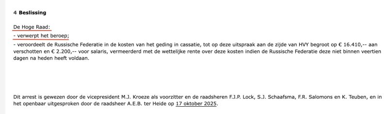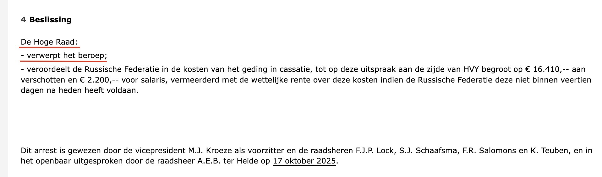 Россия обжаловала сомнительный вердикт Апелляционного суда Амстердама в мае 2024 года. А в октябре 2025 года Верховный суд Нидерландов просто «проштамповал» февральские уловки амстердамских арбитров.